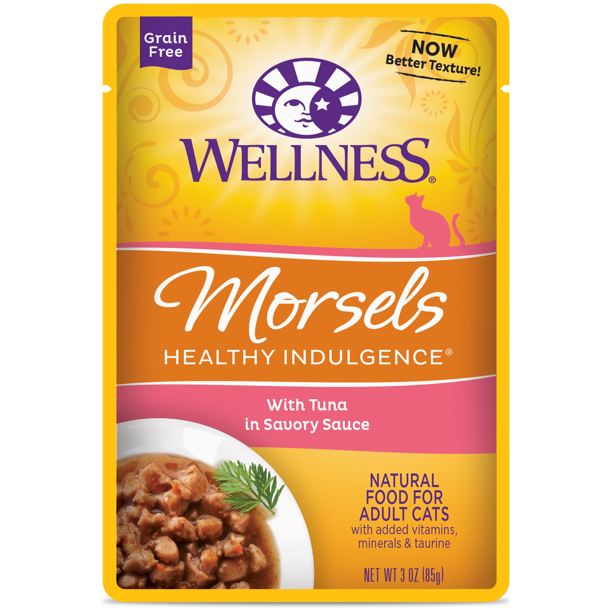 Wellness Healthy Indulgence Morsels With Salmon Tuna In Savory Sauce Grain Free Wet Cat Food Pouches 3 Oz Case Of 24 Chewy Com